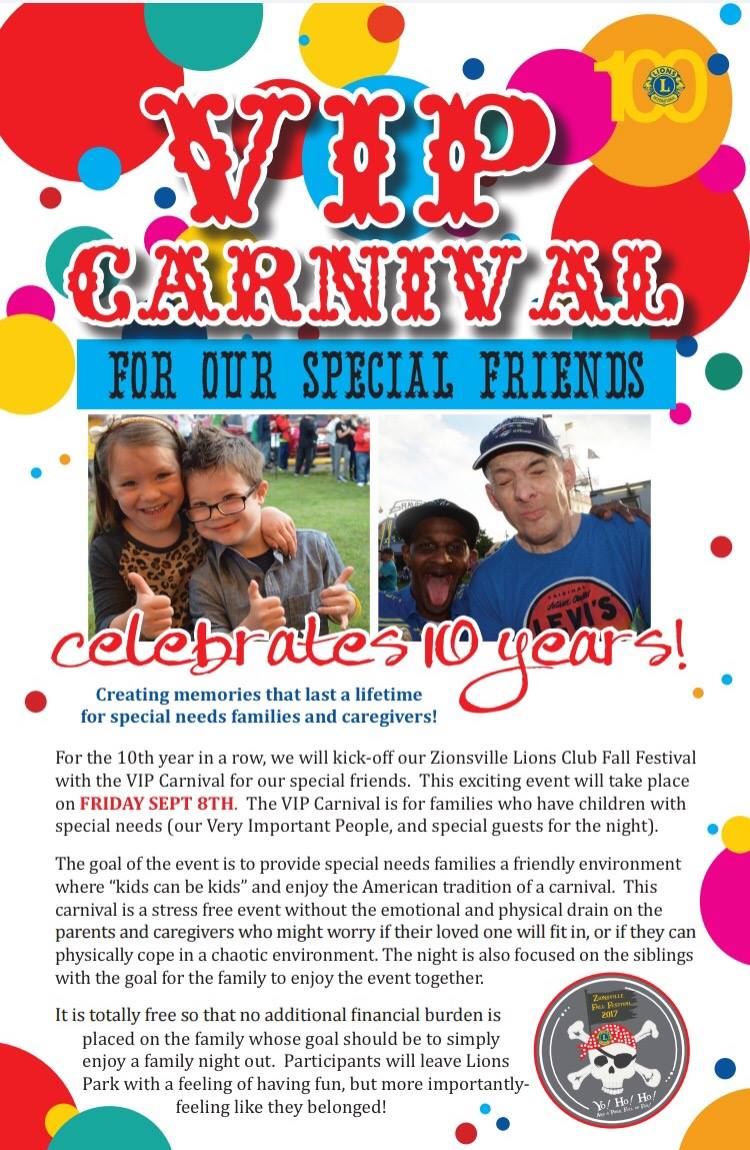 Each year as part of its Fall Festival, the Zionsville Lions Club hosts a free “VIP Carnival” for kids of all ages who have special needs, their families and caregivers. I know how challenging it is to find activities for children with special needs and this is a wonderful opportunity for people with disabilities to enjoy rides, food and games in a supportive, accepting and inclusive environment. I have gone several times and highly recommend it. It’s so nice to see the outpouring of support shown by the community—and even better to see the smiling faces on the kids. This year’s event will be held Friday, September 8, 2017, from 5:00-8:00 PM in Lions Park in Zionsville.
